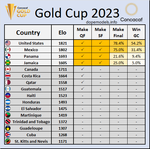 We're down to the final 4 in the CONCACAF Gold Cup 2023 - and not to brag, but the model is undefeated so far!!! It has predicted all 8 quarterfinalists correctly (not necessarily in the right finish order in groups, ok), and favored the eventual winner in all 4 Quarterfinal games. Which means more than anything else this tournament has been pretty chalky. Without further ado, how's it look going forward.